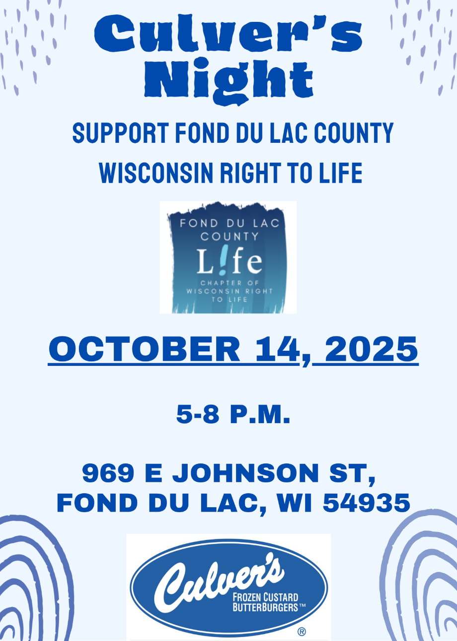Enjoy a delicious meal and support Wisconsin Right to Life, Fond du Lac Chapter. Culver’s will donate a percentage of their sales during the 5 -8 PM period to